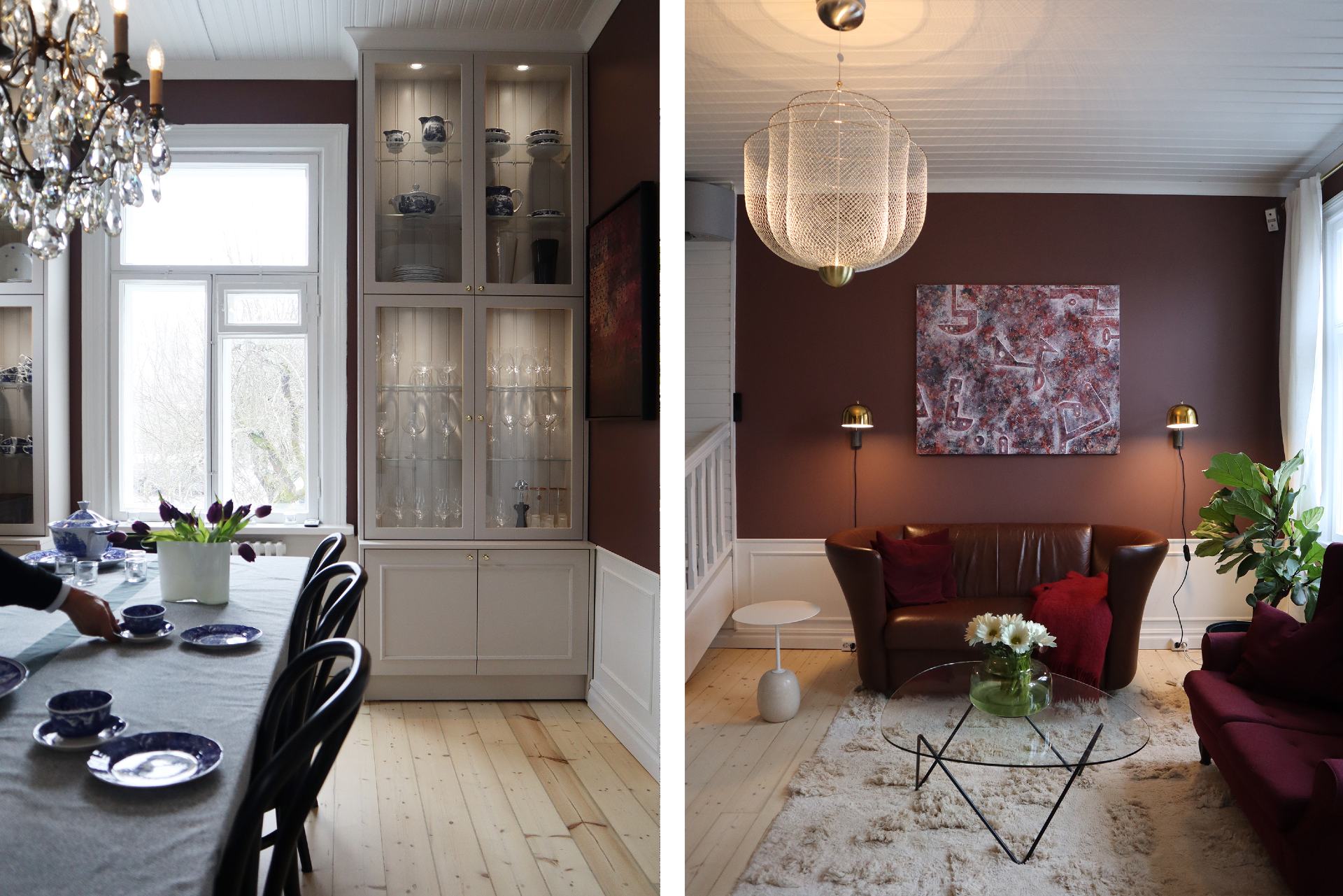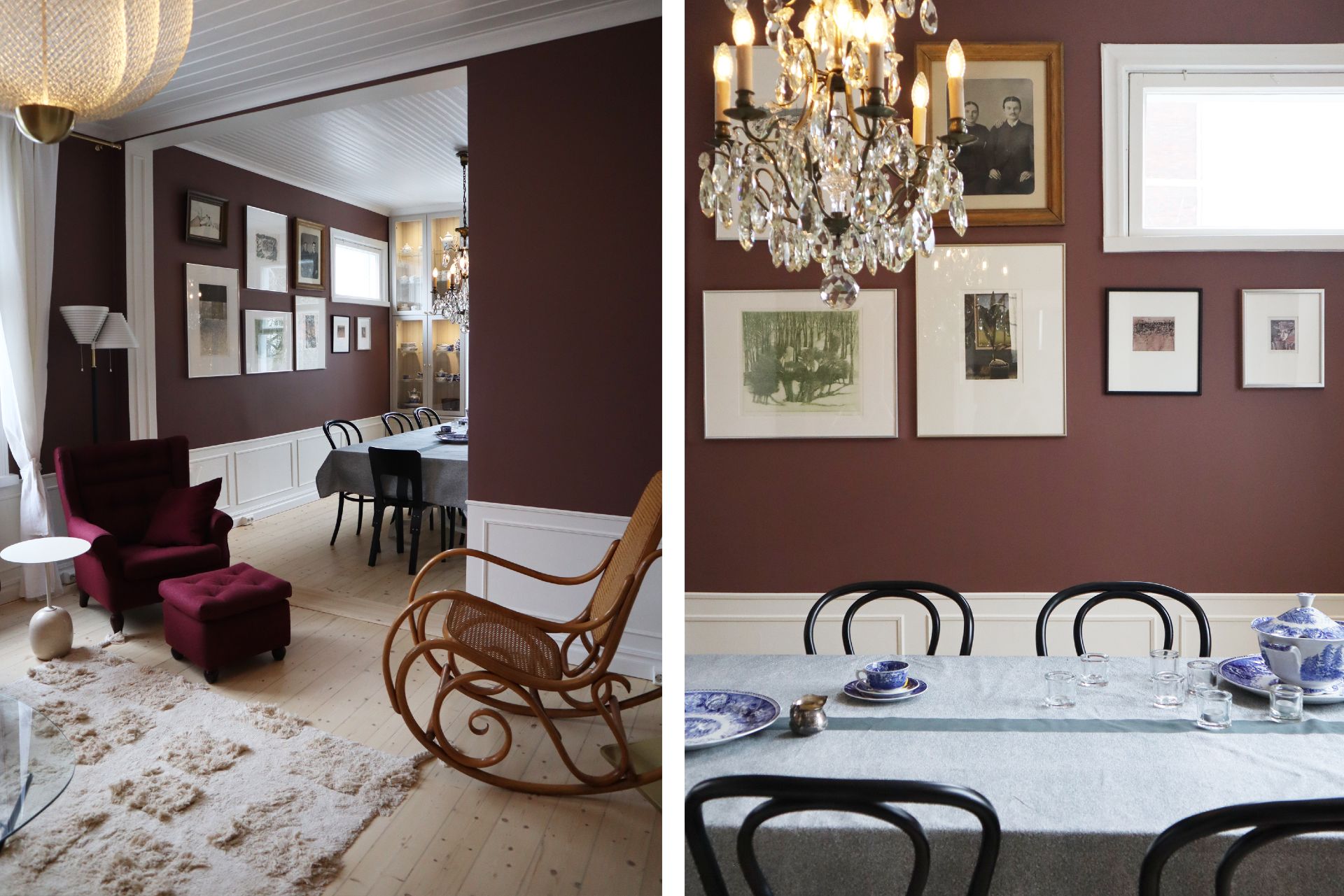 Tässä satavuotiaassa hirsitalossa haluttiin päivittää ruokailutila ja olohuone nykyhetkeen kuitenkaan kadottamatta talon alkuperäistä henkeä. Lähtökohtana toimi tiloista jo entuudestaan löytyvät vaikuttavat taideteokset, joissa hehkuivat punertavat sävyt. Näiden sävyjen ympärille rakennettiin koko uudistuksen väripaletti, ja seinille valittiin harmonisesti sointuva sävy, joka sitoo taiteen ja tilan toisiinsa.
